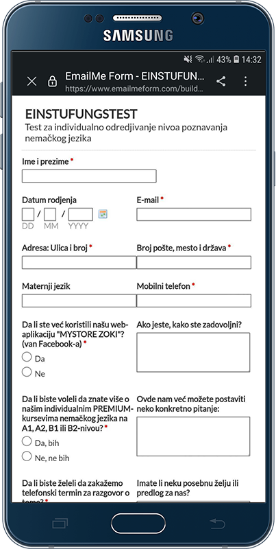 Odradite besplatan test i saznajte na kom je nivou Vaše poznavanje nemačkog jezika. Prijavite se za test ispod (pozivnicu za pristup testu dobijate na svoj email u roku od par sati). Na osnovu rezultata, lako donesite odluku za koji nivo kursa da se prijavite ili za koji sertifikat biste mogli da polažete.